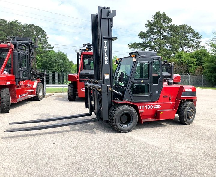 TAYLOR GT-180 INDUSTRIAL FORKLIFT comes with standard features and benefits that include a Deutz TD3.6L diesel engine, automatic shutdown, automatic transmission, spacious operator compartment, fully adjustable suspension seat, simple error proof parking brake, wet disc brakes on all models, rugged upright and carriage, durable chassis, and power assist brakes. The transmission features a 3-speed auto-shift transmission on LPG and diesel models, operator friendly, automatic upshifting and downshifting, modulated shift protection, electrically controlled – no adjustment needed, and an inching valve – left brake pedal operation allows for precisely controlled travel and high speed lifting. The operator base features an adjustable suspension seat with 2.4″ vertical travel and 6″ fore/aft adjustment, adjustable lumbar support, hydraulic and transmission functions disengage if operator leaves seat, thick molded floor mats, low cowl design – greatly increases visibility of forks, tilt steering column, and LCD instrument display. The mast and carriage feature maximum visibility – lift cylinders, chains, and hoses are all mounted within the rail profiler, hydraulic cushioning valve – silent staging reduces shock and vibration, shimmable, sealed, and canted load rollers, circuit