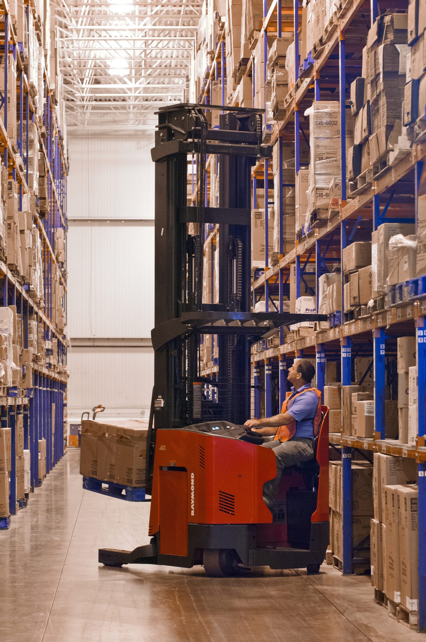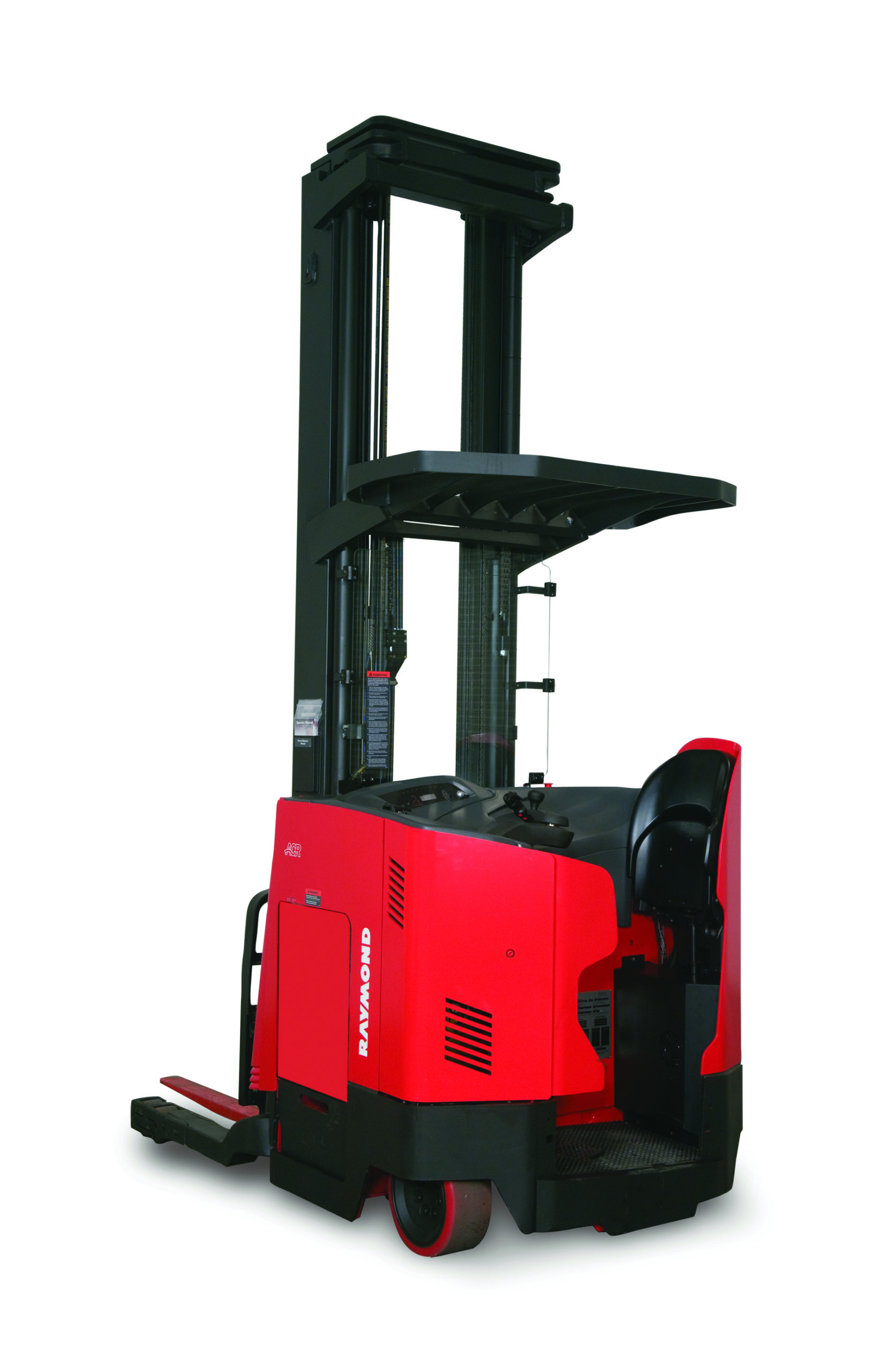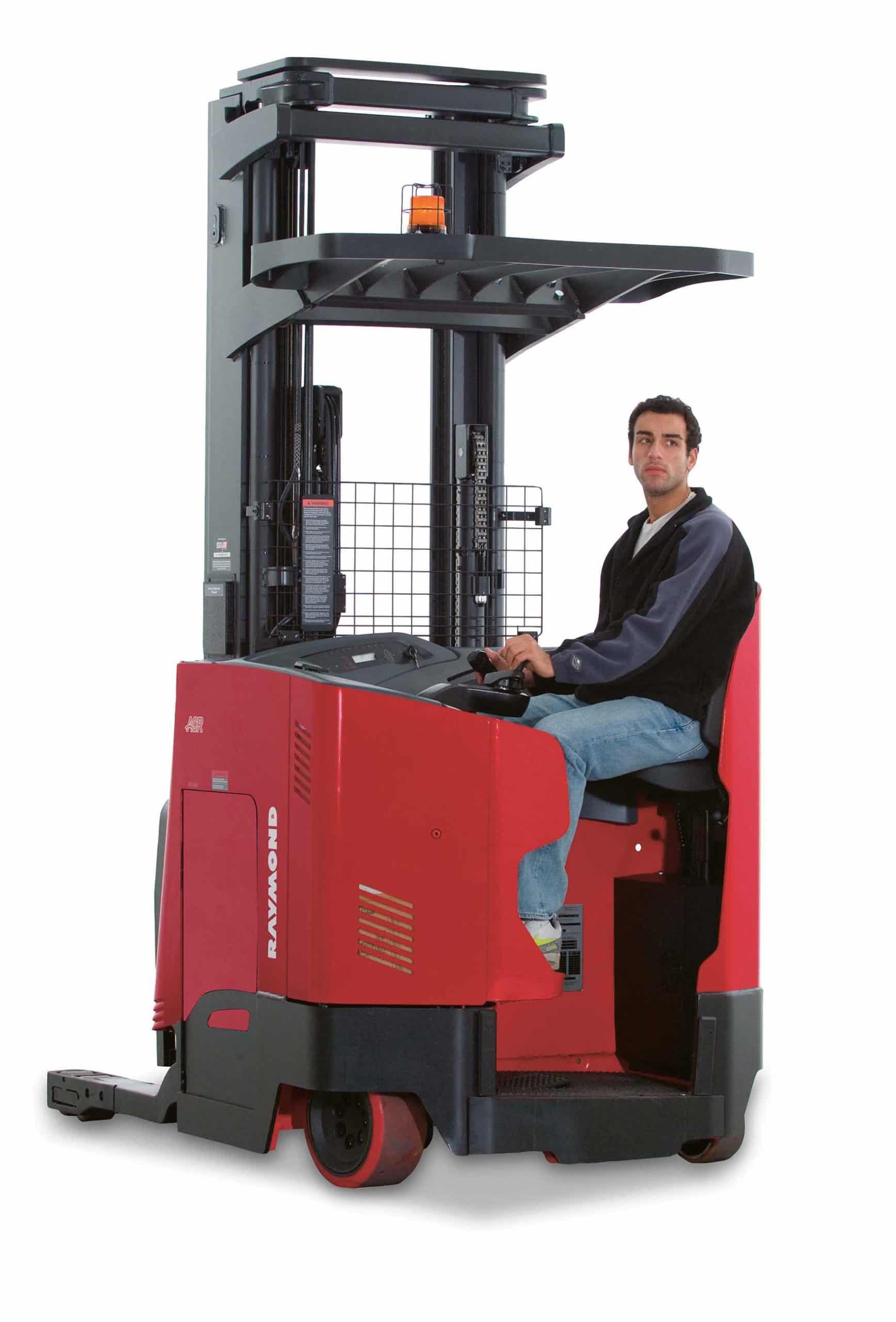 Vantage Point Camera The color display monitor mounted in the operatorâs compartment helps the operator to identify, place and retrieve pallets at greater heights. Fork-tip Laser Guide Assists operators for faster loading and unloading of pallets at height by providing a clearly visible laser guide on the pallet. Height-Tilt Indicator Digital readout shows height of forks and condition of tilt. Ideal for lift heights above 200 inches. ThermaKit System For cold storage warehouses, our padded, heated control handle and heated floor cushion keep your operators warm. By keeping hands and feet warmer for longer, ThermaKit enables improved productivity shift after shift. Operator Compartment Sensor System Designed as a training aid to encourage proper operating procedures. Two light sensors span the entry to the operator compartment, sounding a tone and displaying a message on the operator’s display when the sensors are blocked. If stationary, the truck will not travel if the light sensor is blocked. Virtual Reality Simulator Exclusive teaching tool that puts forklift operators on an actual reach truck in the most realistic virtual warehouse to improve skills, confidence, efficiency and retention. Eliminates the need for large dedicated training areas. Deep-Reach Capacity Raymond double deep reach truck configurations allow for double-deep pallet storage in the racks, saving two out of every five aisles for increased storage density.