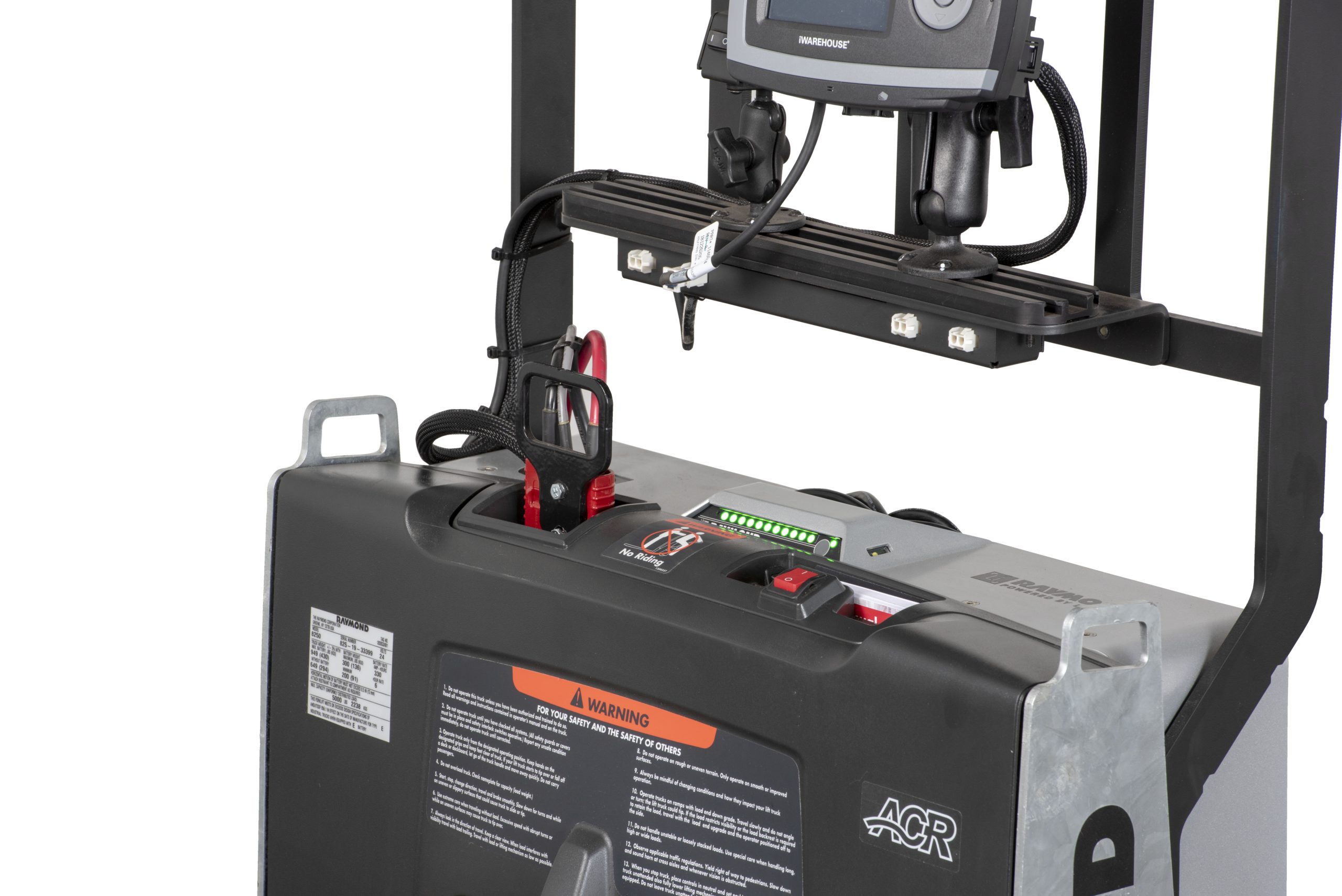 2 CMA Battery Option + 156 amp hour, 24V lithium-ion + Run Time: 6-8 hours (consecutive) + Recharging Time: 6 hours (0-100% SOC) Cold Storage Conditioning All temperature hydraulics, transmission oils and temperature sensing components protect control systems â assuring peak performance and productivity, while stainless steel undercarriage pins protect from corrosion and rust. Accessory Bar Interfaces with RAM-mounted accessories to put additional operator tools at their fingertips; available with optional work light and fan. Pin Code Pad The optional personal identification number (PIN) code pad provides password protection for additional security. Store up to 10 different passwords to prevent unauthorized operation. Large Storage Tote The optional tote helps to keep work tools organized and at your operators fingertips for added convenience and productivity throughout the shift. Extreme Environment Protection Hot-dip galvanization and electronics coatings protect components and extends the life of the truck in wet, corrosive environments. Ideal for processing applications or other environments subject to harsh conditions or frequent wash-downs. Purkeys Trailer Auxiliary Power System Ideal for over-the-road applications, converting DC power to AC power, it can be installed into commercial trailers allowing drivers to plug in and charge their electric pallet jack in between deliveries, during transport, to ensure it is ready for use at every stop.