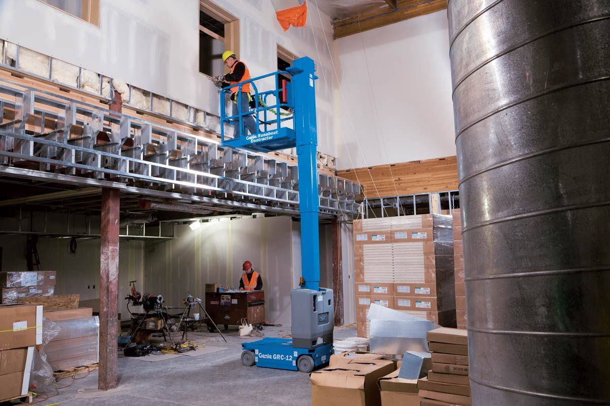 The Genie Runabout Contractor GRC-12 Vertical Mast Lift is a versatile and compact lift that offers a large work space for up to two operators. It features a standard extension deck, low ground clearance, and can fit in most passenger elevators.