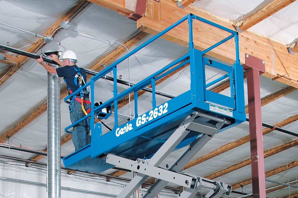 The Genie GS-2632 Slab Scissor Lift provides a large platform workspace with a 36-in (.9 m) roll-out platform extension. High-angle steering offers excellent maneuverability, and folding rails with half-height swing gate come standard. Emergency stop at both platform and ground controls for added safety.