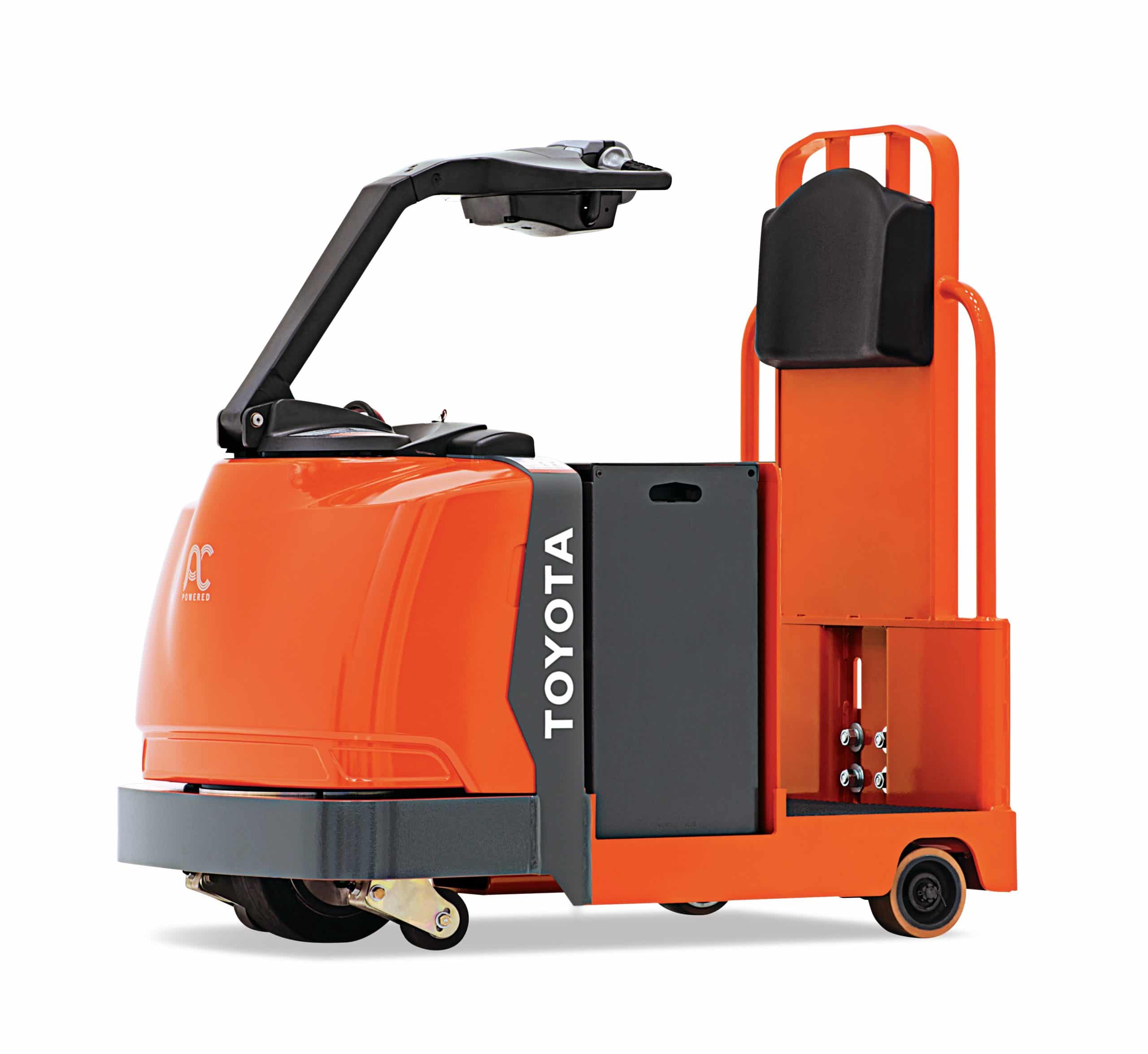 This is a Toyota Core Tow Tractor that features a 24-volt electrical system, regenerative braking, and an axle weldment rubber suspension system.
